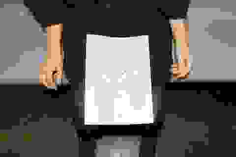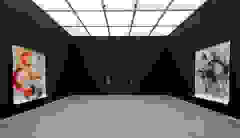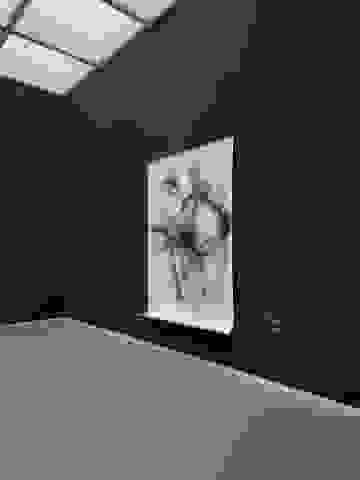 We are now behind the image, looking at its reverse. We are in a space that is usually inaccessible. Lights out. Shapes are barely discernible through the paper and the transparent screen of the display, wedged beneath the gallery ceiling.