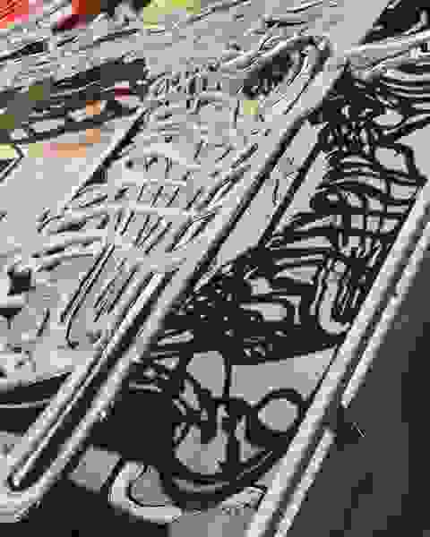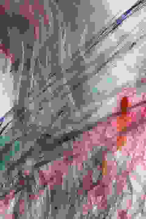Winter 2023/24, studio in Long Island City. There, among the large iron subway bridges and industrial wastelands, I find a small iron spring, which I have since used to scratch into the surface of the papers. This creates furrows and cracks that become visible through the overlay of color and pigment. The surface of the painting was to become more tactile, rougher, sparkling. Iron mica, Caput Mortuum pigment scattered across the surface. Over it, scarlet shellac ink in calligraphic structures. After two months – wrap again, move, store.