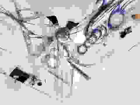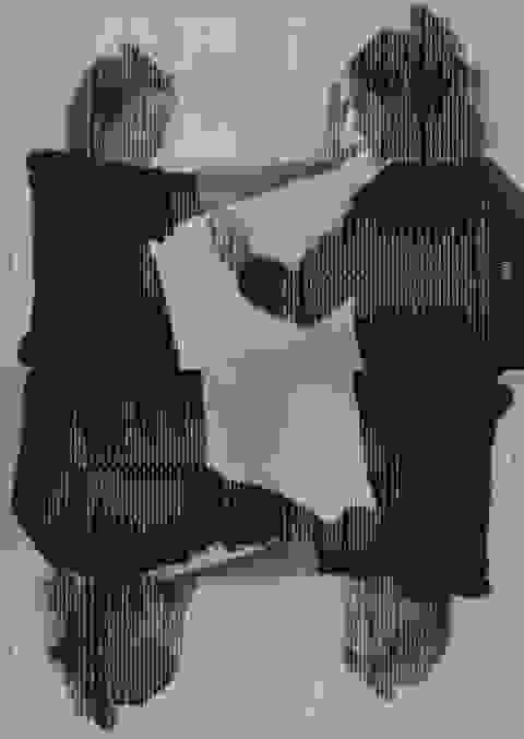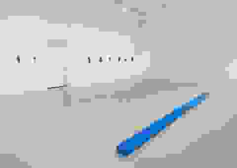 Interweaving of sulptural performance and graphical image development. A plastered and painted field in DIN A ratio serves as field of action and a mega layout space. Using their stock material Hammann von Mier develop new sculptural sets. The player on the field gives the impulse and choses the material, the other player on the gallery directs the image and documents it. A selection of these images was put into the format of a publication. During the exhibition the field stays empty. In the video piece Hammann von Mier are synchronously carrying out an always consistent series of hand movements referring to choreographies of mechanical production, an unreadable code. If an error occurs, the series has to be paused or re-started.