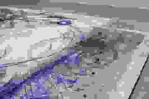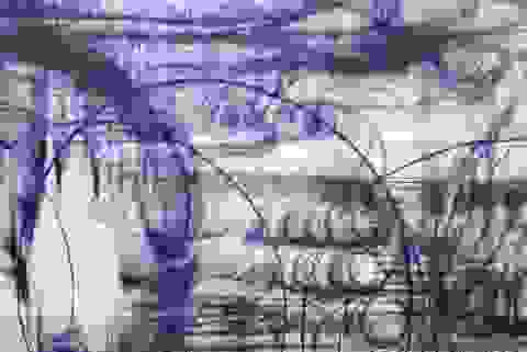 The paper fills the whole studio floor, 17 × 18 feet. There is no outside, no walking around it. I walk backwards and step into a bowl of ink, it splashes, I continue walking through the picture with wet, blue socks. I have to stop for today.