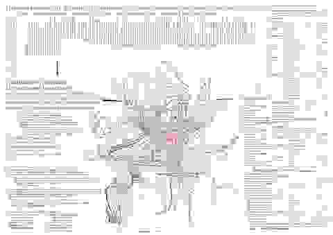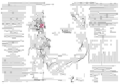 For the Thesis exhibition, the drawing is displayed on a floating pedestal made of plywood and folded folding tables. The drawing rests lightly on it. Its lines still run from south to north, from north to south.