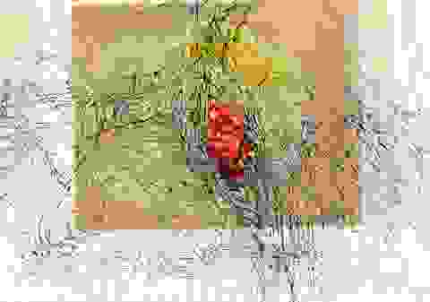 „Der Amazonas brennt, It’s not fire it's capitalism, und der Regenwald ist keine Kathedrale, und in der Uckermark brennt's, weil die Feuerwehr mal wieder was zu tun braucht, sagt vielleicht der Mann, der uns die Brombeeren bei sich pflücken ließ. Meine Hände danach ganz pink gefärbt, meine Mundwinkel auch. Die Hitze, die Dornen, die Wespen, die Sonne. Der Rundgang durch den Garten wird klingen, riechen, schmecken, sich gut anfassen und ansehen lassen. Die einzelnen Orte und deren Vegetation und Details sind die Narration der Ausgangspunkt einer Geschichte, die keine ist, sondern Notizen aus der Zeit der Residency, in sich nicht geschlossen, lose Fäden von Gleichzeitigkeiten direkt an mir in mir um mich im Internet am Telefon in den Nachrichten und Feeds in Gesprächen und Gedanken meinen und andererseits Schlagzeilen und Fakten und Meinungen und Lügen und Vorstellungen alles durcheinander. Es soll ein Blick ins Detail gehen und dann wieder wegspringen in die Totale oder zumindest der Versuch in die Objektivität und die Relation, die Beziehung zur Welt. Es sind diese Bewegungen, denen ich folge und die ich im Zeichnen auf dem Papier vor mir ablege. Ich bin dann so Antenne und Verstärkerin und Lautsprecherin.“