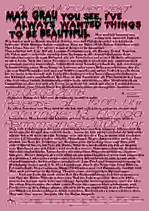 Transcripts of experienced, present and past, and fictional nights. Telling each other about being lost and in extacy, flirting but not falling in love, pretending, dancing, building legends. Made for our installation/bar “HAMMANN VON MIER/VON MIER HAMMANN” at the artist-run bar die Hyperkapitalismus, Kammerspiele München (theater of the City of Munich). Edited during the night in that same bar one week earlier. Erschöpfung / liegen 6.30am / S sagt, komm wir legen uns hin, alle gemeinsam / lass uns alle gemeinsam einfach hinlegen / und schlafen / das wäre toll / Alles wird gut / : / Harmonie in München / Die Anderen da draußen in den Supervierteln / tun wieder so, als wäre alles in Ordnung.