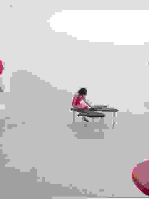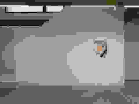 Interweaving of sulptural performance and graphical image development. A plastered and painted field in DIN A ratio serves as field of action and a mega layout space. Using their stock material Hammann von Mier develop new sculptural sets. The player on the field gives the impulse and choses the material, the other player on the gallery directs the image and documents it. A selection of these images was put into the format of a publication. During the exhibition the field stays empty. In the video piece Hammann von Mier are synchronously carrying out an always consistent series of hand movements referring to choreographies of mechanical production, an unreadable code. If an error occurs, the series has to be paused or re-started.