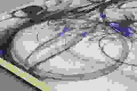 Gedanken, die sich berühren; Drei Brücken [—], 2024, India ink, pigment, oil crayon, charcoal, and acrylic on perforated paper, 72 x 119 cm / approx. 28 x 47 inches