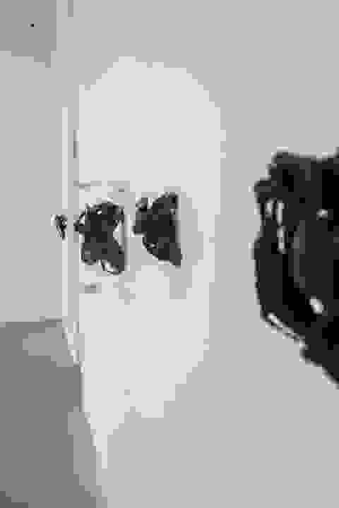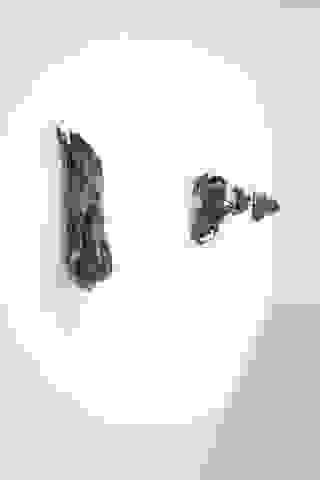 The starting point for the four-part work “Koordinaten” lies in the images and atmospheres that the word “Mulde” (depression, hollow) evokes in me. A “Mulde” is a soft indentation, a perceptible recess, a notch, an inward movement, a descent, a negative space – the interior of the mouth where language becomes body, the vault of the back of the skull, darkness. I shaped hollows in wax into the palms of my hands. They are hand-sized, Maria-scale. They were cast in bronze using the lost-wax method, blackened with acid and fire, and coated with a thin layer of wax. In the exhibition space, the objects are embedded in the wall, leaving only the openings visible. The wall replaces the negative space of my hand. The openings are arranged in relation to my body: starting at the center of the forehead, then clockwise, reaching upward with the right hand, then down to the navel, and finally, with the left hand at chest height, pressing thumb to index or middle finger. Visitors are invited to repeat this gesture, placing their hands in the hollows and feeling the surfaces with their fingers. Over time, the black patina will wear off at the points of contact.