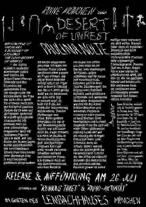 Transcripts of experienced, present and past, and fictional nights. Telling each other about being lost and in extacy, flirting but not falling in love, pretending, dancing, building legends. Made for our installation/bar “HAMMANN VON MIER/VON MIER HAMMANN” at the artist-run bar die Hyperkapitalismus, Kammerspiele München (theater of the City of Munich). Edited during the night in that same bar one week earlier. Erschöpfung / liegen 6.30am / S sagt, komm wir legen uns hin, alle gemeinsam / lass uns alle gemeinsam einfach hinlegen / und schlafen / das wäre toll / Alles wird gut / : / Harmonie in München / Die Anderen da draußen in den Supervierteln / tun wieder so, als wäre alles in Ordnung.